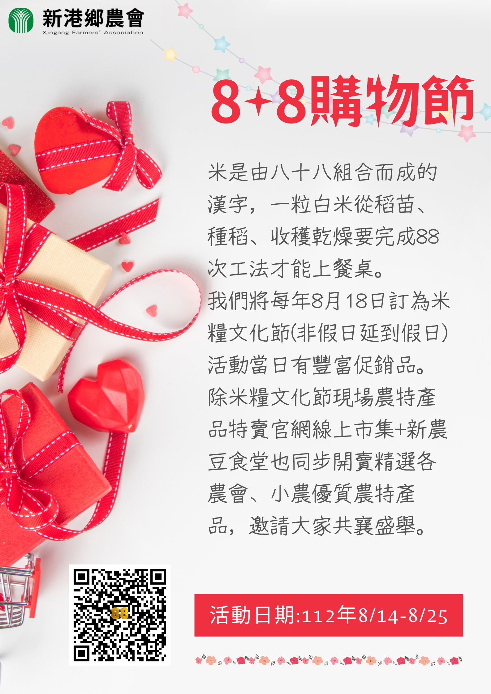米是由八十八組合而成的漢字,一粒白米從稻苗、種稻、收穫乾燥要完成88次工法才能上餐桌。 我們將每年8月18日訂為米糧文化節(非假日延到假日)活動當日有豐富促銷品。 除米糧文化節現場農特產品特賣官網線上市集+新農豆食堂也同步開賣精選各農會、小農優質農特產品,邀請大家共襄盛舉。