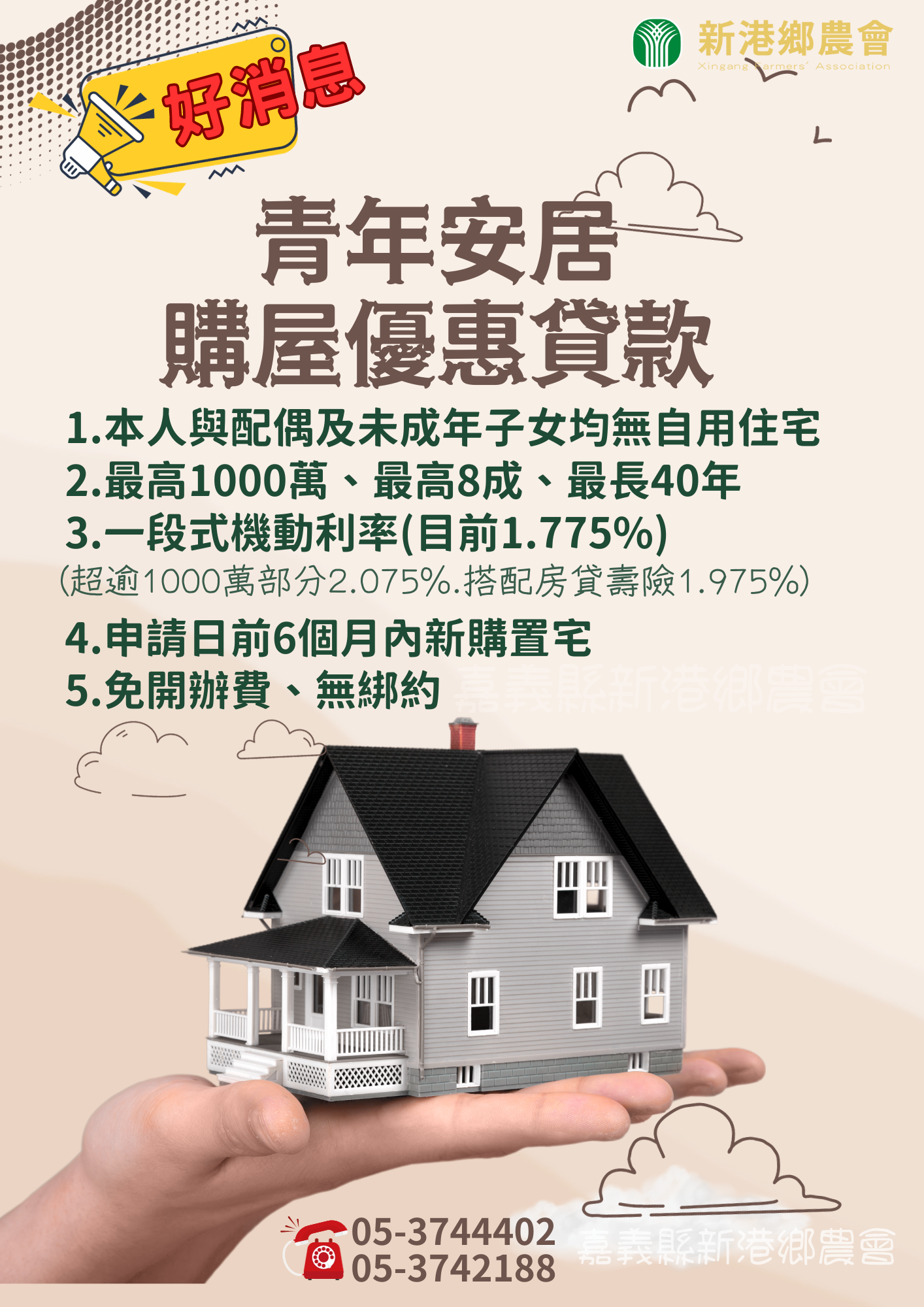 好康大放送!! 購屋族福利來了 農會版「青年安居購屋優惠貸款」 為農民打造「安居樂業」的生活 貸款資格: 1.本國籍成年人、本人、配偶及未成年子女均無自有住宅 2.優惠利率:一段式機動利率(目前1.775%) 3.貸款成數:最高8成 4.貸款年限 : 最長40年 5.貸款額度:最高1000萬元 (超逾1000萬部分2.075%.如搭配房貸壽險1.975%) 6.貸款條件 : 申請日前6個月內新購置宅(不包含轉貸件) 7.受理期間:112/10/1~115/9/30 8.承辦機構:新港鄉農會信用部 9.電話 : 05-3744402.05-3742188 本項貸款新港鄉農會具有最終准駁核貸權