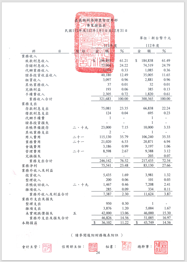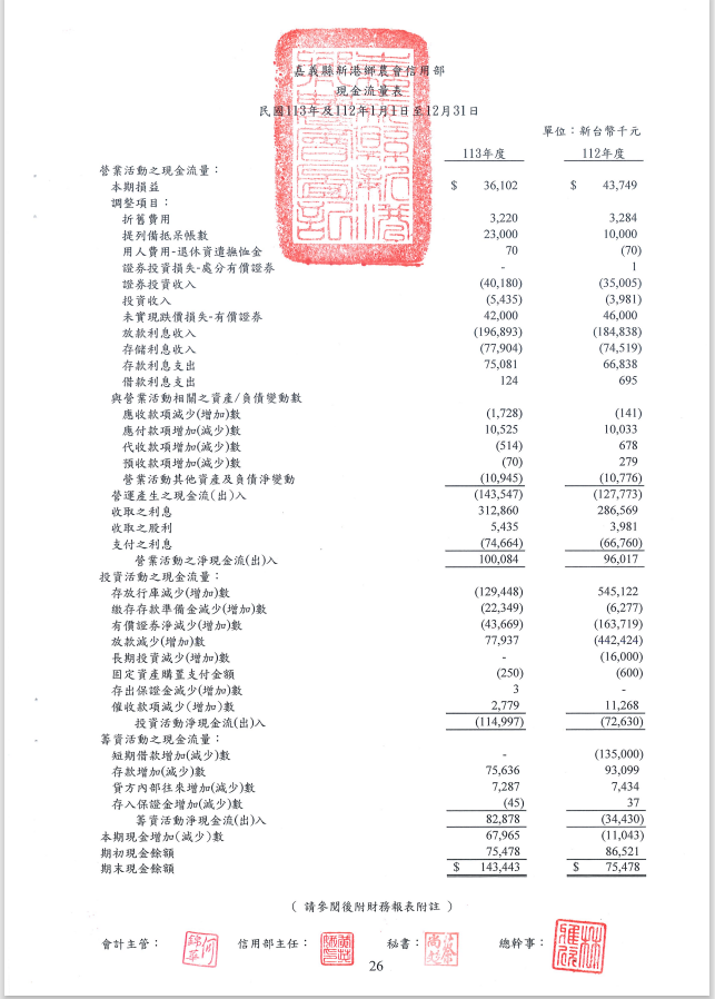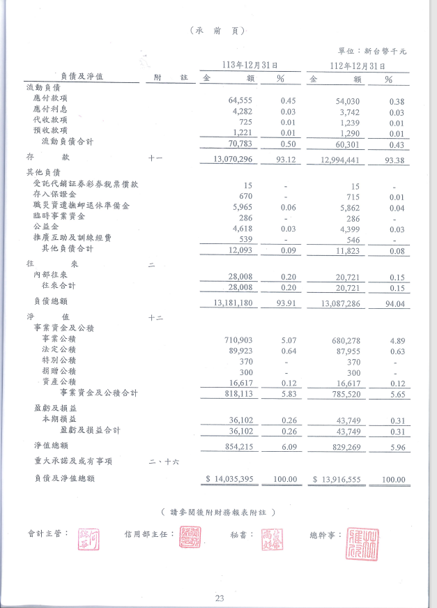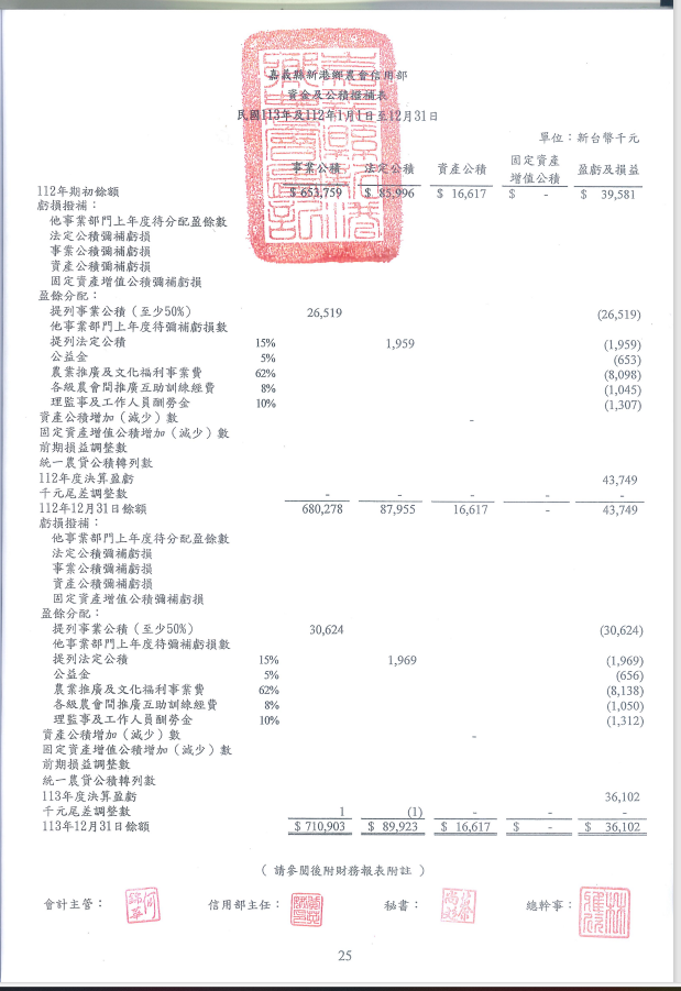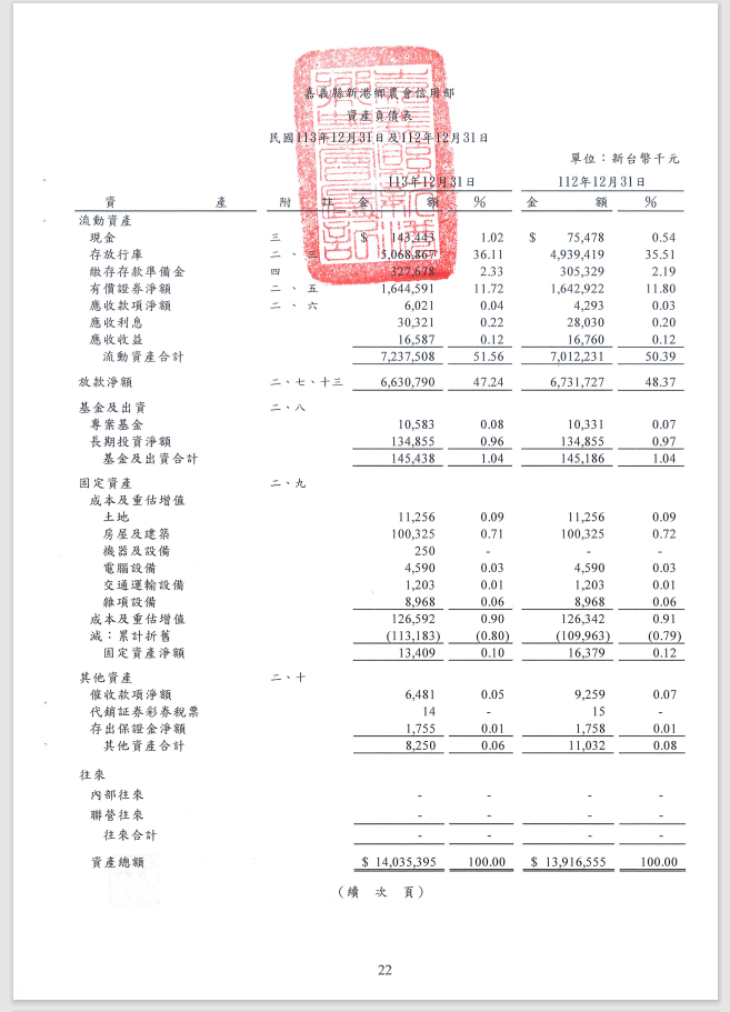 113年度新港鄉農會信用部資產負債表