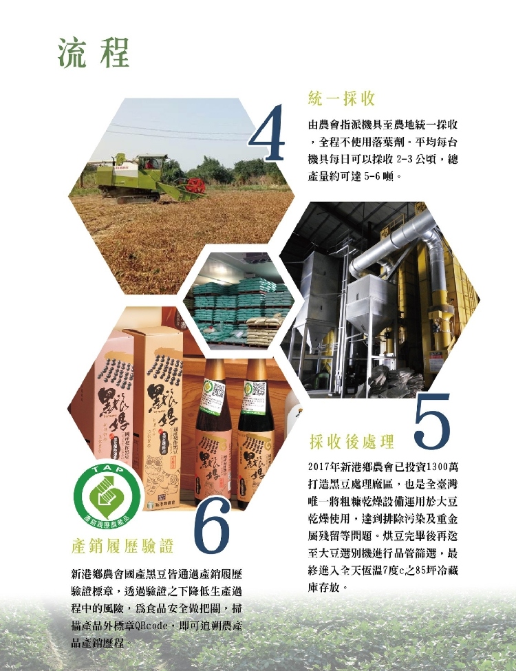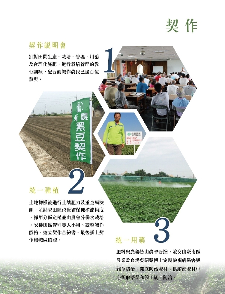 配合農糧署推動雜糧產業發展相關政策,推動方便機採、相對省工的黑豆,藉此增加農民種植信心,「農民跟著農會契作,又有產銷履歷保證,最後推出我們自己品牌的加工品。」從2015年起步即有37甲種植面積,如今已能繳出破百甲的成績單。