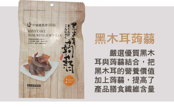 天然的蒟蒻加上中埔鄉的特產黑木耳,做成含豐富膳食纖維、天然有嚼勁、具有飽足感,現代人最愛的養生零食。